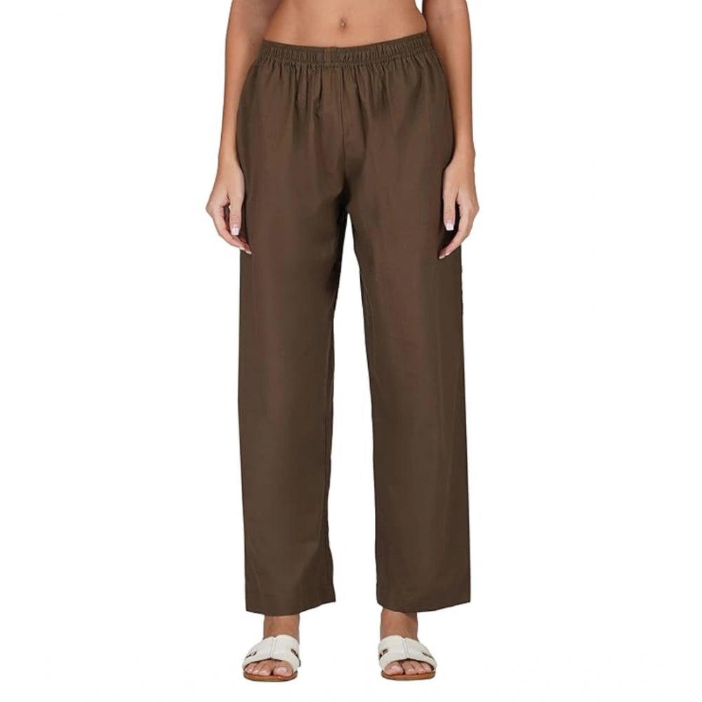 Generic Women's Casual Cotton Cambric Solid Elastic Palazzo Trousers (Brown)