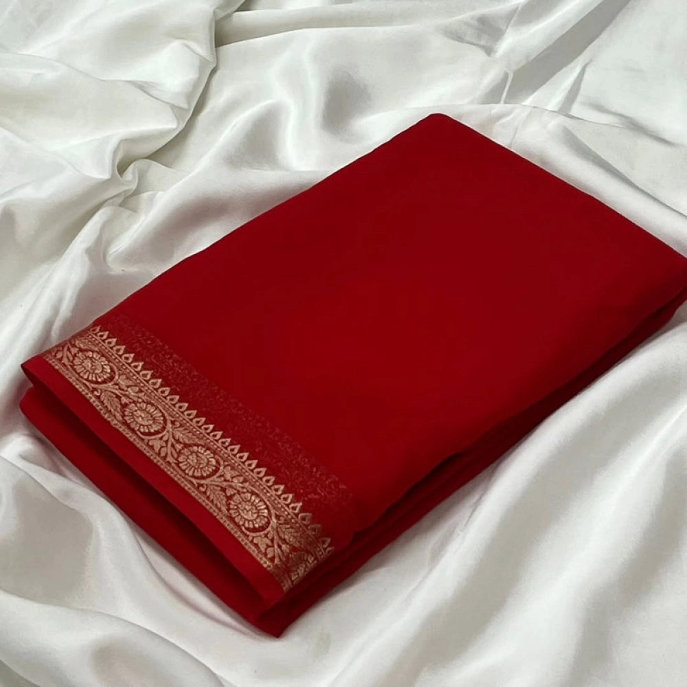 Generic Women's Crepe Chit Pallu Solid Saree With Unstitched Blouse 5.5Mtr (Red)