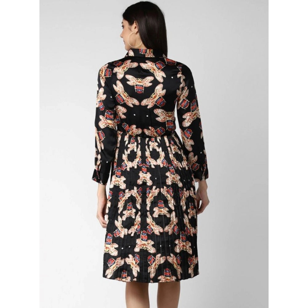Generic Women's Polyester Pleated Collar Neck Long Sleeves Dress (Black)